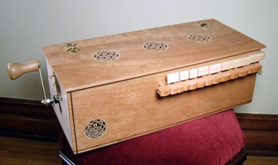 At right is the magnificent medieval Symphonie. It has two melody strings, two drone strings and no trompette or "buzzing bridge". This style of hurdy gurdy is commonly depicted in iconography of the 10th through the 15th centuries. It has a sweet, quieter tone than the larger Bosch instrument or the more modern gurdy, both of which have a trompette. |