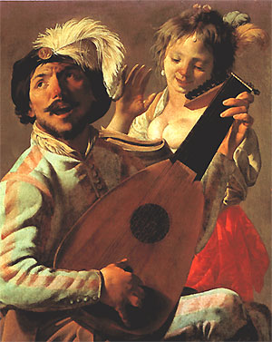 This picture, Duet, by Hendrick Ter Brugghen, 1628, showns a ten course lute with raised chanterelle on the pegbox (for the top string). | ||||||||||